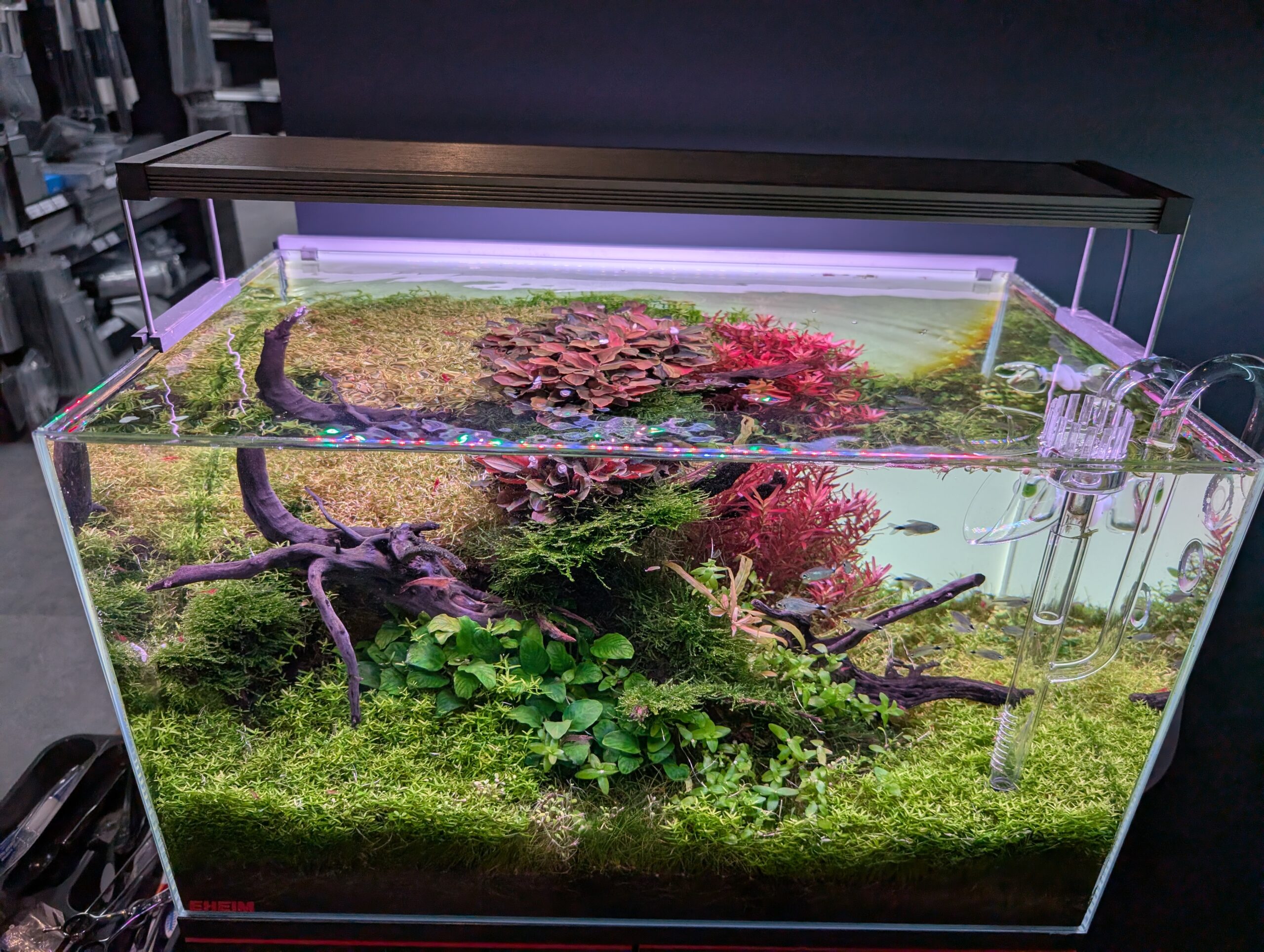 The scapes all look great, even the newish ones. No algae anywhere in sight and the water always looks sparklingly clear. Interesting most of the scapes have a white background or even a lit white background. I think I prefer without.