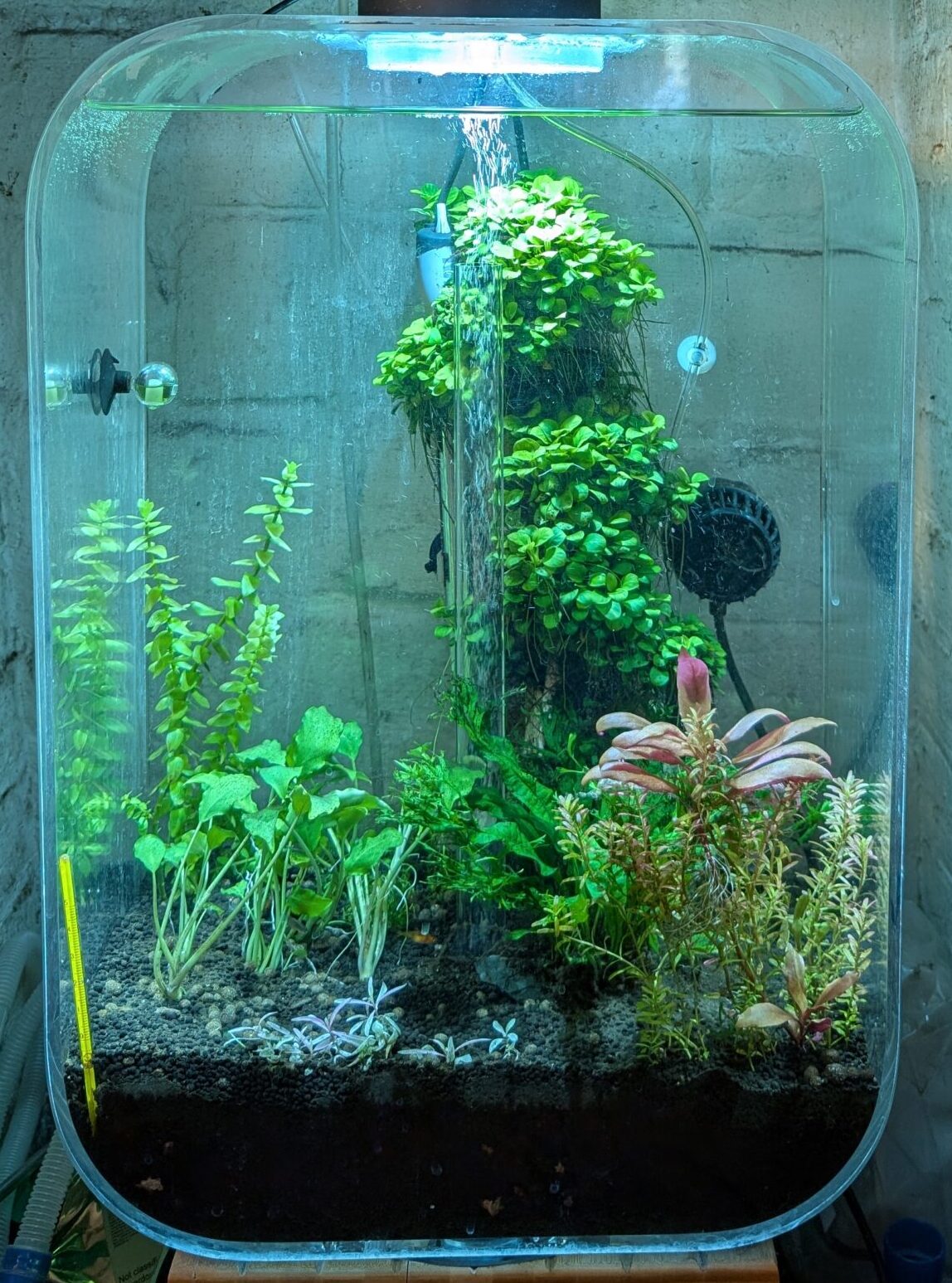 It was time for another large rescape in the Fireplace Aquarium.  I really like the Schismatoglottis look so am reinstalling that.  Taking out the large forest was straightforward to do and it all came out in a block without a lot of excess mess.  The roots don’t actually go super deep so they don’t dig up a lot of debris coming out which I appreciated.  As previously, temporarily installing a retrofitted (with more and finer filter pads) Eheim miniUP did a nice job of polishing the water.  A few iterations with a turkey baster was all that was needed.  After all was said and done the soil level did come down a bit – I didn’t replace the biOrb ceramic media that got pulled up – so I added two cups of fresh Tropica aquarium soil to make up the difference.