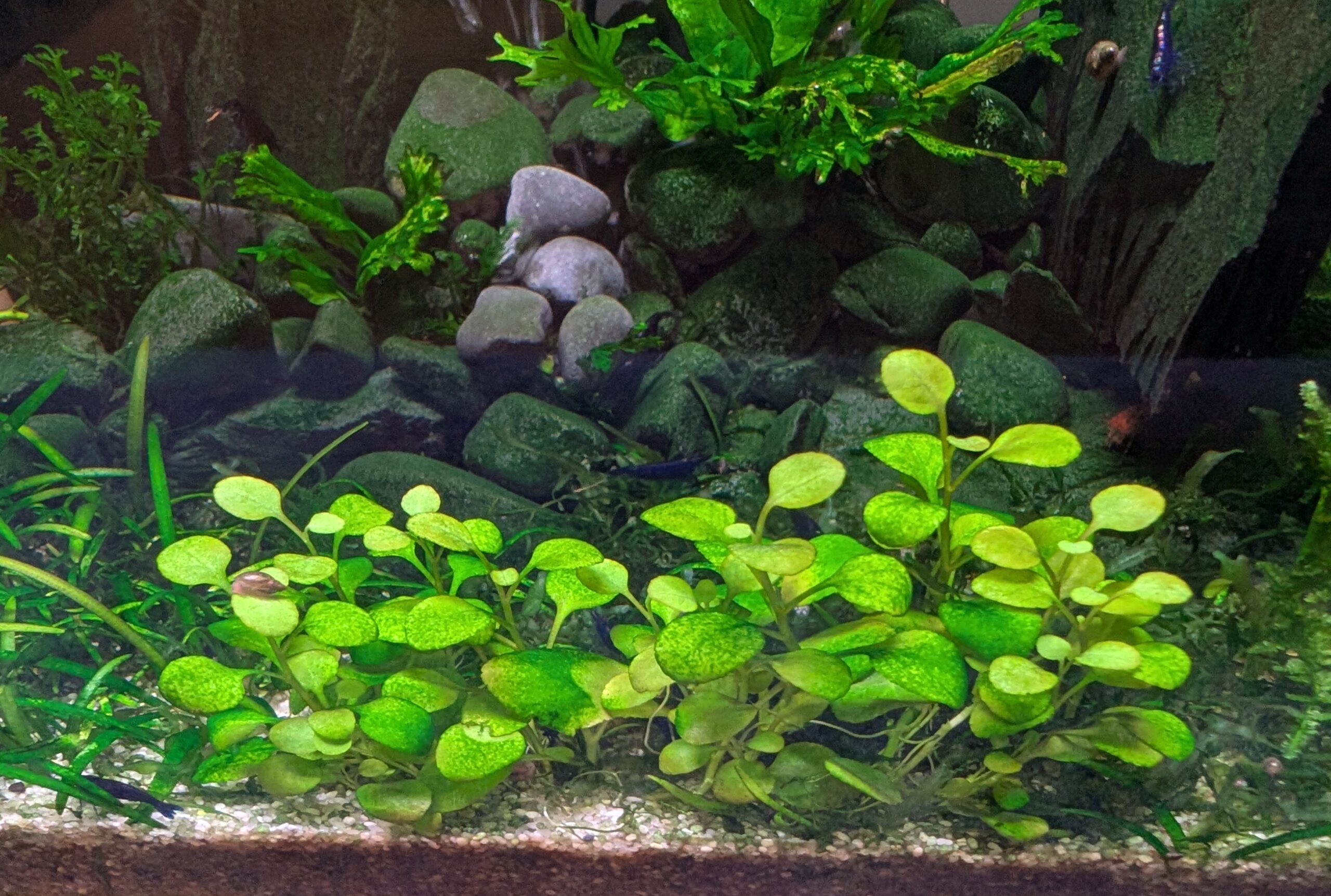Sometimes there is wisdom online if you know where to find it and then actually listen to it. Clive at UKAPS for example advises against the “photon cannon” approach of blasting your aquarium with too much light. Too much light causes problematic algae. Lately I haven’t been very happy with algae in the Shrimphaus. The lit surfaces of the glass gets coated with a layer of what I thought were diatoms but now think is more of an algae-containing biofilm. More problematic however is green spot algae which colonises older plant leaves, in many cases very aggressively. One problem with nice LED lights like the Week Aqua series on the Shrimphaus is it can be very tempting to creep the intensity up over time. When first installed, I started the Week Aqua at 20% power, but now it’s set to 40% power. I think that’s the cause of these algae problems.